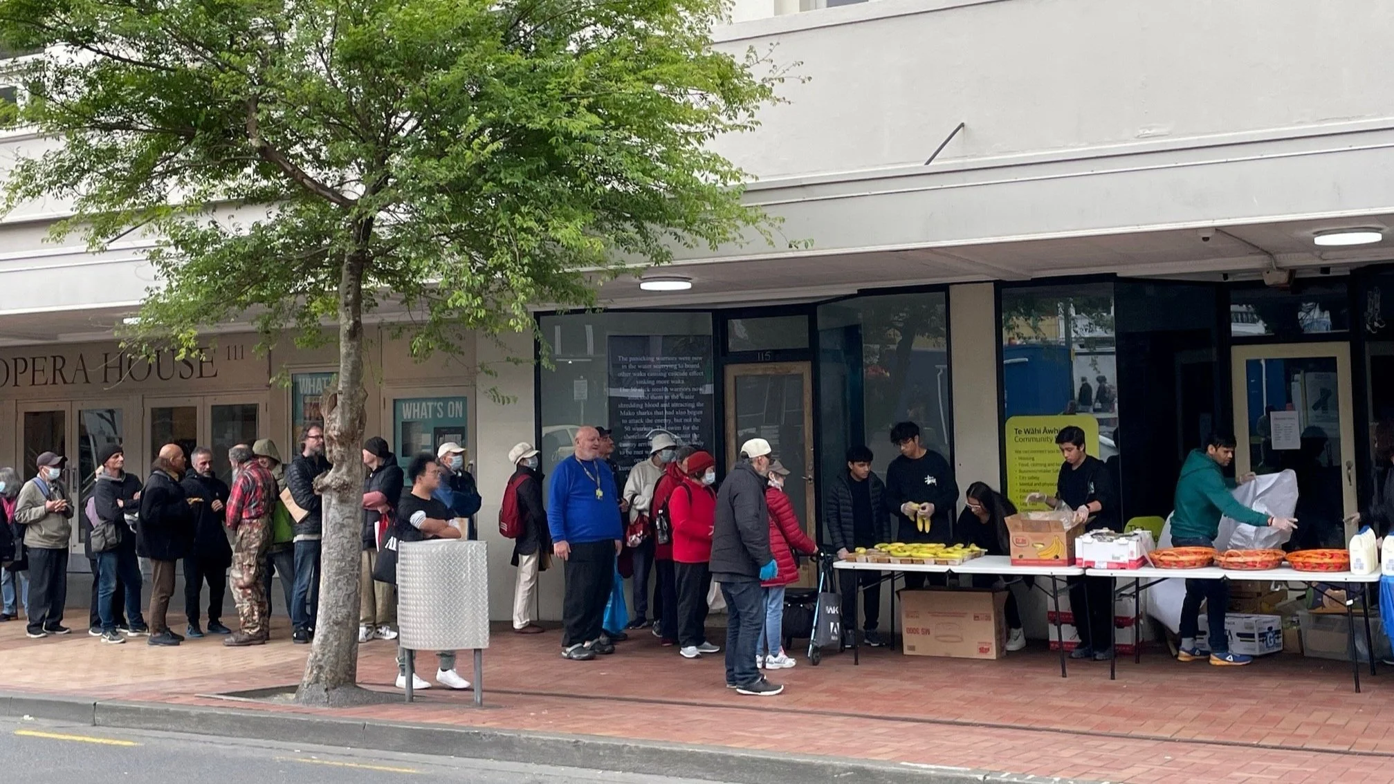 Around 4pm, a line starts to form outside the Wellington Opera House as new deliveries are unpacked, tables are reconstructed, milk is sourced from the dairy down the street, sandwiches, fruit and coffee are laid out neatly and a volunteer offers pieces of pizza to people in the line before food distribution starts at 4.30pm.
